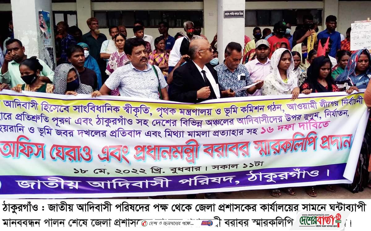 ঠাকুরগাঁওয়ে আদিবাসী হিসেবে সাংবিধানিক স্বীকৃতি, পৃথক মন্ত্রণালয় ও ভূমি কমিশন গঠনসহ ১৬ দফা দাবিতে মানববন্ধন ও প্রধানমন্ত্রী বরাবর স্মারকলিপি পেশ করা হয়। আজ বুধবার জেলা প্রশাসকের কার্যালয়ের সামনে ঘন্টাব্যাপী মানববন্ধন শেষে জেলা প্রশাসকের মাধ্যমে প্রধানমন্ত্রী বরাবর স্মারকলিপি প্রদান করা হয়।