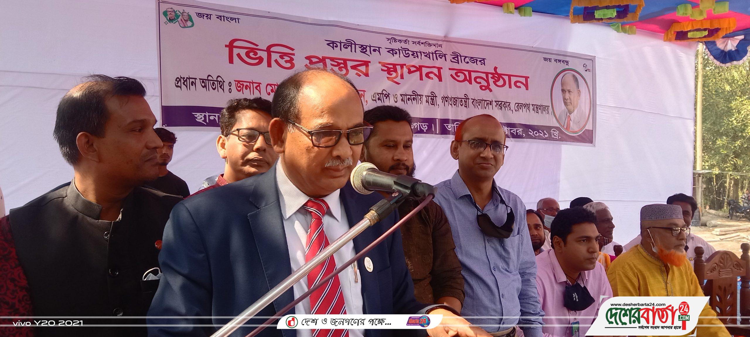 দেবীগঞ্জ উপজেলার কালিস্থান কাউয়াখালী এলাকায় তিস্তা নদীর উপর ব্রীজ নির্মাণের ভিত্তি প্রস্তর এর উদ্ধোধন করা হয়।রেলপথ মন্ত্রী মো: নুরুল ইসলাম সুজন এমপি শনিবার দুপুরে ভিত্তি প্রস্তরের উদ্ধোধন করেন। মন্ত্রী বলেন, সরকার উন্নয়নের রাজনীতিতে বিশ্বাসী। সরকার পরিকল্পিতভাবে দেশকে এগিয়ে নিয়ে যাচ্ছে। রাস্তা, বিদ্যুত, অবকাঠামো নির্মাণ, কৃষিতে ভর্তকি, গরীবদের মাঝে ঘর প্রদান , ফ্লাইওভার নির্মাণ, রাজধানীতে মেট্রো রেল চালু করনের কাজ করছে। সরকারের লক্ষ্য হলো ২০৪১ সালে বাংলাদেশকে একটি উন্নত ও সমৃদ্ধশালী দেশ হিসেবে বিশ্বের মানচিত্রে তুলে ধরা। মন্ত্রী সকল ভেদাভেদ ভূলে শেখ হাসিনার পাশে থাকার জন্য সবাইকে আহবান জানান। প্রায় সাড়ে ৬ কোটি টাকা ব্যয়ে ২৭০ গজ লম্বা ব্রীজ নির্মাণ কাজ বাস্তবায়ন করবেন স্থানীয় সরকার প্রকৌশলী বিভাগ। উপজেলা নির্বাহী অফিসার প্রত্যয় হাসান সভায় সভাপতিত্ব করেন। অন্যদের মধ্যে বক্তব্য রাখেন, এলজিইডির সিনিয়র সহকারি প্রকৌশলী আব্দুর রহিম আকন্দ, উপজেলা আওয়ামী লীগের সভাপিত ও সাধারণ সম্পাদক গিয়াস উদ্ধীন চৌধুরী ও হাসনাত হামান চৌধুরী জর্জ,উপজেলা আওয়ামী লীগের সিনিয়র সহ-সভাপতি ও ৭নং টেপ্রীগঞ্জ ইউনিয়নের চেয়ারম্যান গোলাম রহমান সরকার,দেবীগঞ্জ পৌরসভার মেয়র আবু বকর সিদ্দিক আবু সহ উপজেলা আওয়ামী লীগের নেতা কর্মীরা।